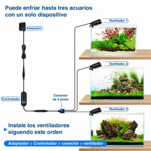 Fabricado con materiales de alta calidad como plástico ABS y motor con núcleo de cobre, garantiza una larga vida útil y funcionamiento silencioso (<50 dB), sin molestar ni a ti ni a tus peces. El ventilador incluye un divisor de 3 pines de 1 metro y un práctico interruptor manual de encendido/apagado.
