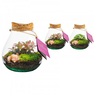 Se trata de un ecosistema autosuficiente donde las plantas viven en equilibrio gracias al ciclo natural del agua: la humedad se evapora, se condensa en el cristal y vuelve al sustrato, creando un microclima estable y de bajo mantenimiento. Son ideales para decorar hogares y oficinas con un toque natural, elegante y sostenible.